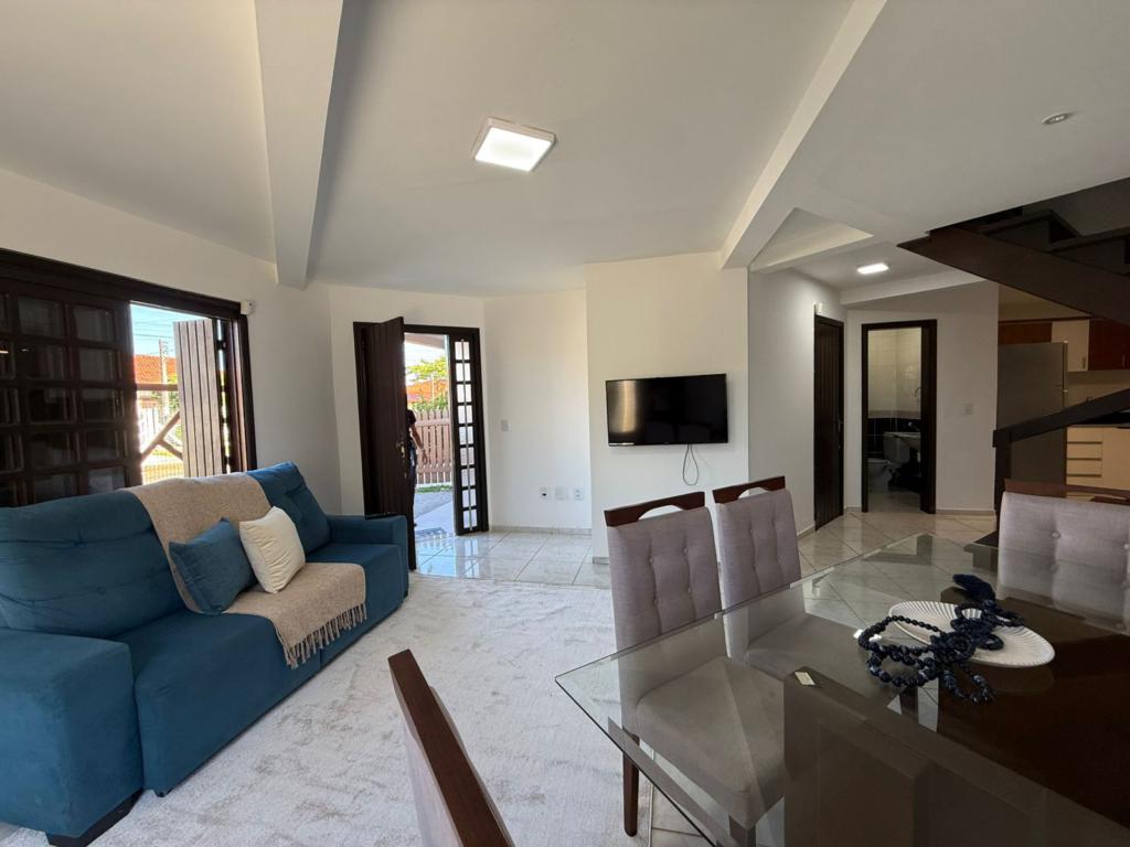 Duplex mobiliado, composto de 3 dormitórios, sendo 1 suíte com sacada, salas de estar e jantar integradas e equipadas com lareira, banheiro social, lavabo, garagem, área de serviço e churrasqueira, aberturas de madeira nobre, posição solar leste, rua pavimentada de P.A.V.S (blocos de concreto).