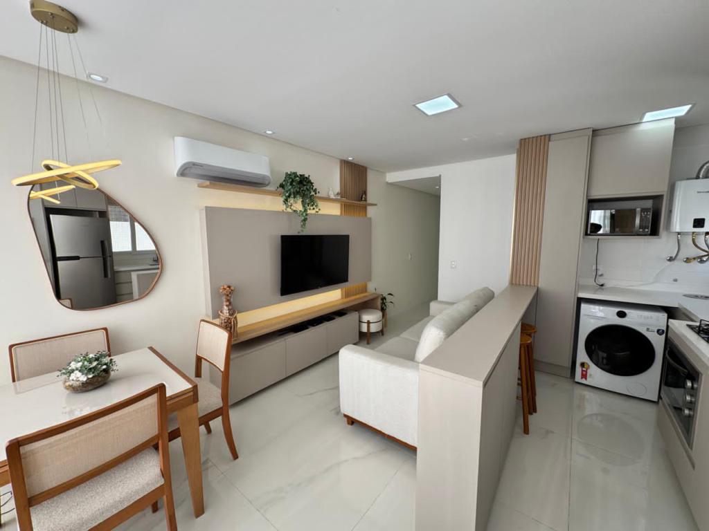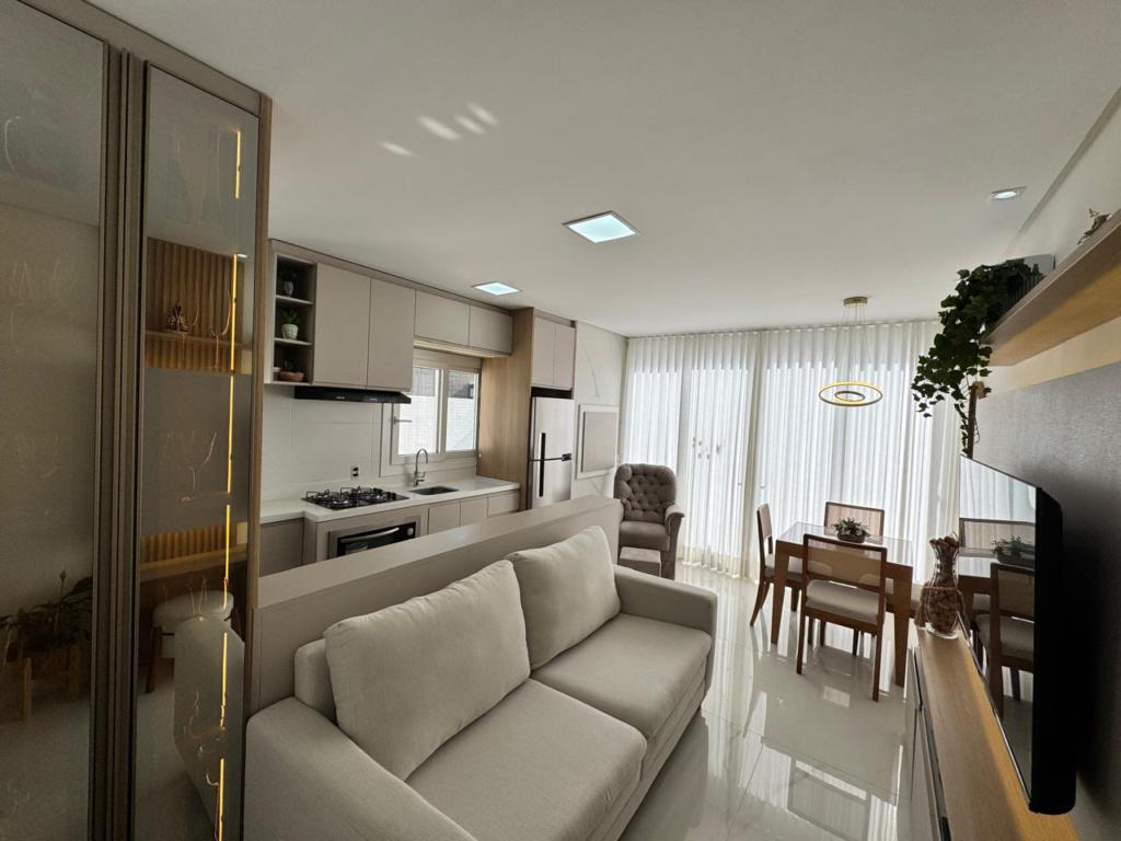 Lindo apartamento com terraço, mobiliado e decorado, composto de 2 dormitórios (1 suíte), living integrado, banheiro social, churrasqueira com sistema rotativo, cozinha ao estilo americano, área de serviço, box para 2 veículos no térreo, porcelanao, acabamentos de gesso, iluminação de led, sistema de aquecimento de água a gás. Edifício oferece, elevador com resgate automático, hall decorado, rooftop, academia, salão de festas e piscina.