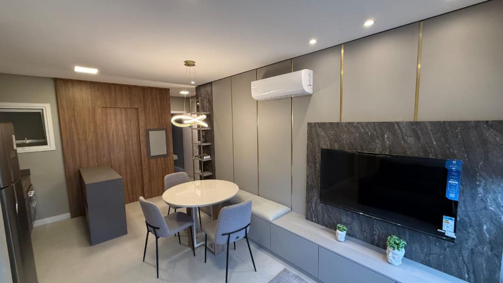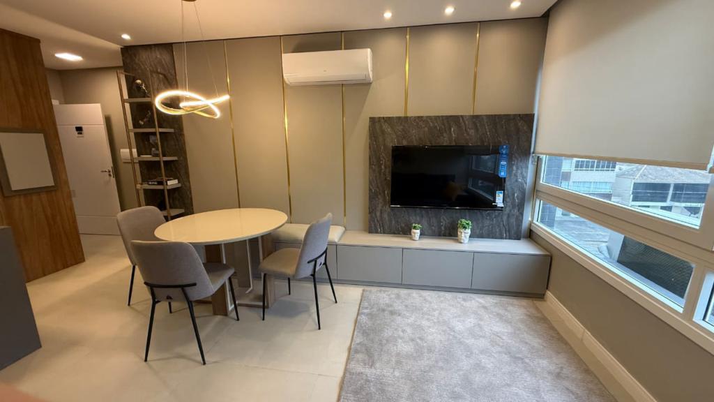Apartamento mobiliado e decorado, composto de 1 dormitório, banheiro social, salas de estar e jantar integradas á cozinha, área de serviço, box de estacionmento.