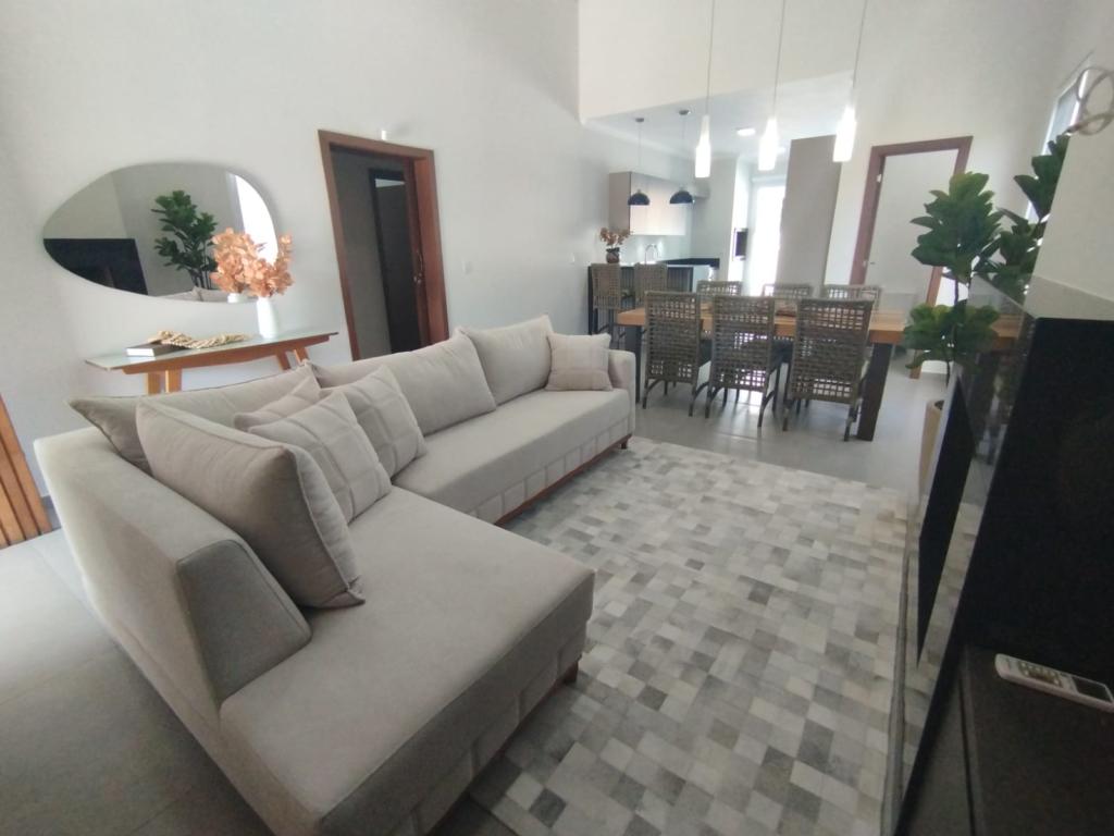Residência mobiliada (móveis sob medida, novos), decorada e equipada, composta de 3 dormitórios (todos suítes), sendo 2 americanas e 1 individual, salas de estar e jantar com pé direito duplo, cozinha integrada ao estilo americano, lavabo, área de serviço, churrasqueira e piscina, aberturas externas de PVC, com automação de persianas nos dormitórios, aberturas internas de WPC, porcelanato, acabamentos de gesso, iluminação de led, sistema de aquecimento de água a gás e jardinagem, parte dos fundos fechada com muros, parte frontal de quadro com telas e portão deslizante.