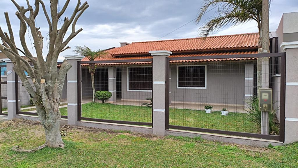 Residência composta de 3 dormitórios, sendo 1 suíte, salas de estar e jantar, cozinha ao estilo americano, banheiro social,abrigo para automóvel, churrasqueira, área de serviço separada da casa, localizada nos fundos do terreno, pátio completamente murado no fundo e na parte da frente fechado com tela e portão deslizante, aberturas e forro de madeira. localização para moradia ou veraneio, todo acesso por asfalto, posição solar leste (frente mar).