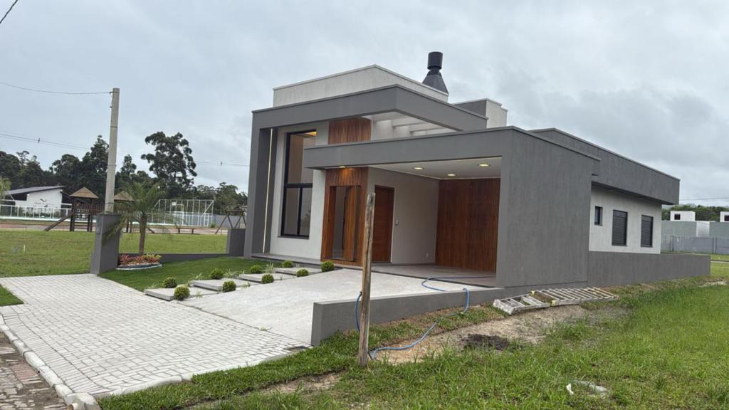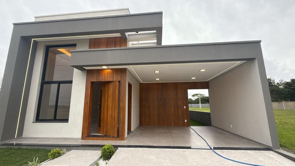 Linda casa, nunca habitada, composta de 3 suítes, banheiro social, estar e jantar integrados, espaço gourmet, lareira, churrasqueira, área de serviço, abrigo para veículos. Piso porcelanato classe AA , acabamentos de gesso, pé direito duplo, porta frontal pivotante de madeira nobre, ripado de madeira nobre na área de cobertura veícular, toda externa iluminad de led embutido, janelas de alúmínio anodizado na cor preta e com persianas de nylon, acabamentos de gesso e jardinagem.